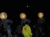 白い布をかぶったままの気球は、内部で光り始めつつ、くらげのように上空に漂い昇って行く..(このあとの写真を取り損ねたのだが、この気球は紐で係留されたままなので、漂い去ることはなく上空で静止し、そこで布が取り払われた巨大な球体は、地上の満月のごとく明るく輝き、そしてそれを背後に残して、白い巨人たちは広場をあとにして歩み去る..)
