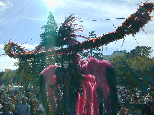 写真でおわかりのとおり、素晴らしいコスチュームを身にまとったスティルト(高足)トリオであり、ビジュアル・インパクトはピカイチ..しかし、そこまで [;^J^]。叫び声を上げながら、愛嬌を振りまきつつ、歩き回るだけなのであった [;^J^]。芸をしろよ、芸を! [;^.^]凸