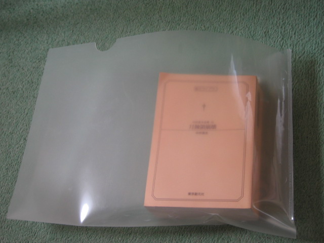 こういう鞄(あるいはリュック等)の中に(他の荷物と混ぜて)書籍を詰め込む時に、書籍を保護する方策のひとつとして、100円ショップなどで購入できるファイルケースに入れる、という方法が考えられるが、これが案外、うまくいかない。多くの場合、文庫本よりサイズが(かなり)大きいので、鞄の中の空間の無駄遣いになることと、このケースの中で書籍が“遊んで”、ガタガタ動くのである。つまり、かえって傷つく原因となりかねない。書籍の厚みよりもやや薄め、程度が丁度いいのであるが、この条件をピッタリ満たす文庫本の方が少なかろう。(当然、分厚すぎる文庫本は、入らないわけだし。)