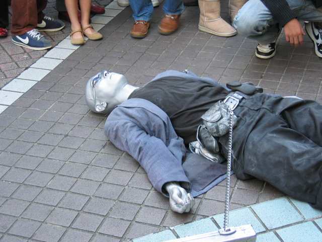 毎年、楽しみにしている、ロービング・パフォーマー(会場内を回遊しながら、突然、パフォーマンスをハプニング的に始めるパフォーマー)。とにかく、この銀一色の雄姿を、見てくださいよ! [^.^] この写真では何をしているのかと言うと、投げ銭ボックス(アタッシュケース)にコンセントを差し込んだまま、ピクリともせずに横たわっているアンドロイドの人、という設定なのである。(多分。)誰かが投げ銭を入れるたびに、その音に反応して、ビクビクッと、少しだけ動く..かように、「静止芸」が基本なのであるが、地面の上を泳ぐなど、激しいアクションもしたりする。私は、彼のファンである。