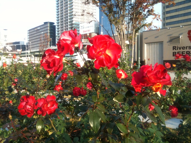 中之島のこのあたりは、公園地帯である。左はバラ園の写真。右は北岸から対岸を臨む。とにかく快晴で、ほんとうに良かった [^J^]。東端まで辿り着いたところで、西側にUターンし、南岸に沿って大阪市立科学館まで歩く。ここには午後に立ち寄る予定なので、およその距離感を身につけておくためである。