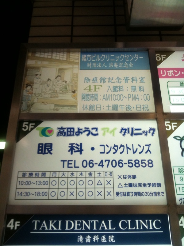 いったん、中之島を離脱して、緒方ビルの除痘館記念資料室に戻る。(ここでちょうど正午となる。)手塚治虫ゆかりの地とあって、表の看板には「陽だまりの樹」が引用されている。小さくて見えないかな。