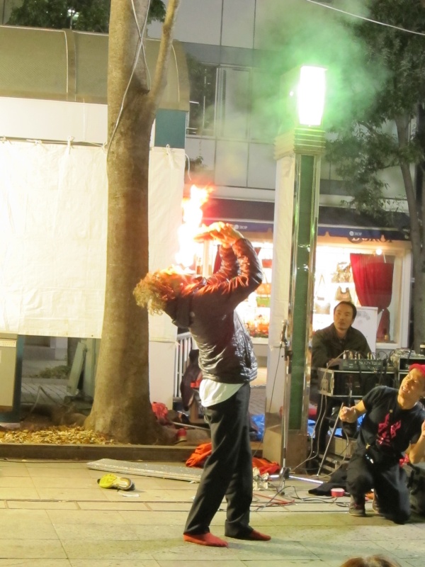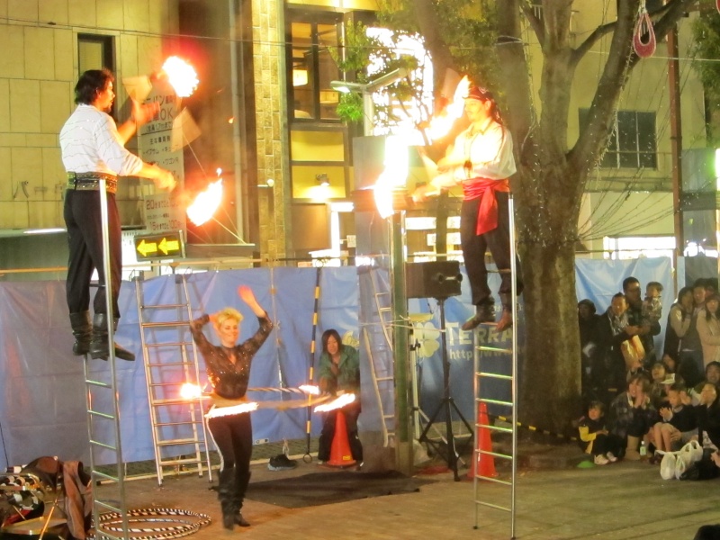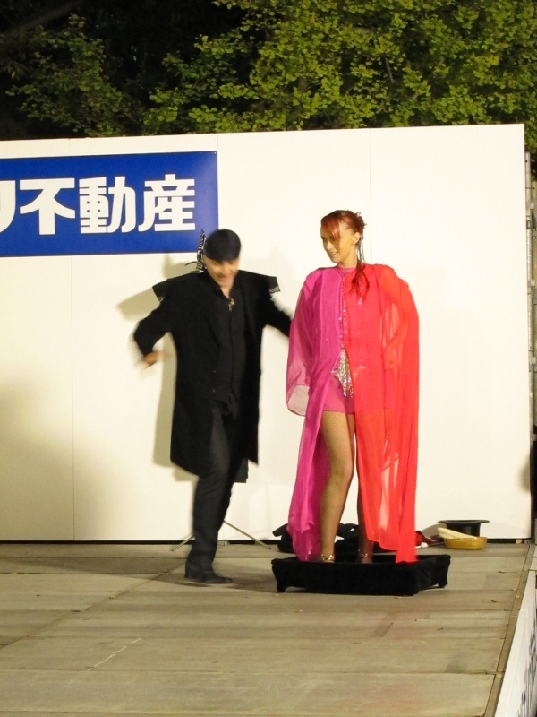 日英コンビ。以前は、不気味な巨人のかぶりものを見せてくれたのだが、今回は、それは無し。オーソドックスな火の芸など。それにしても、どうしてこうも写真が傾いておるのか。[;^.^]