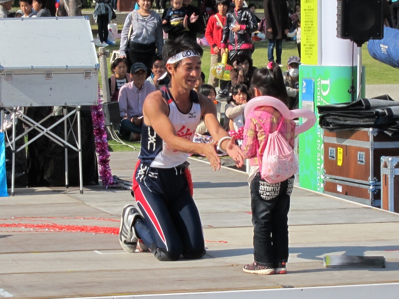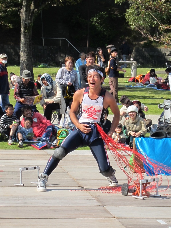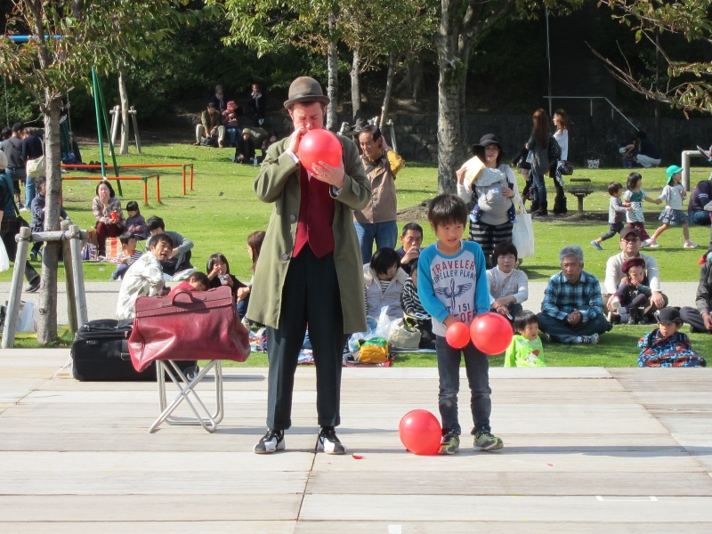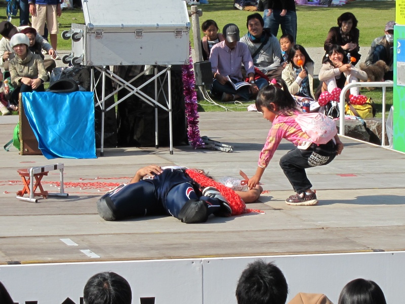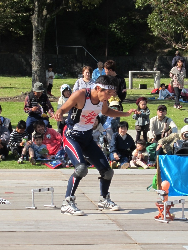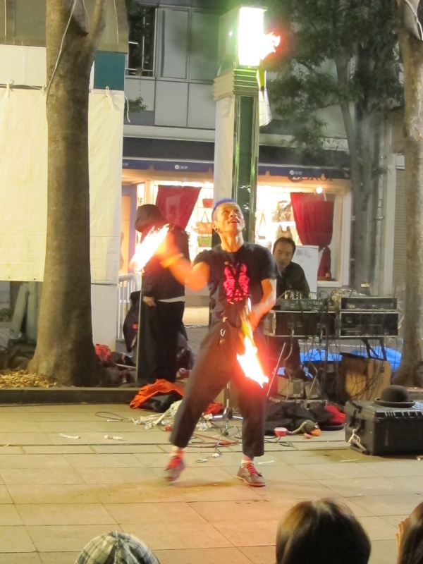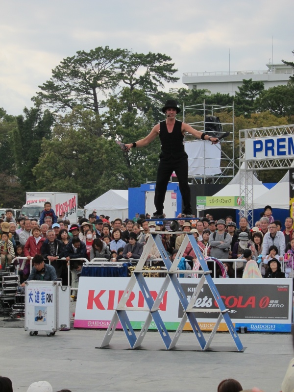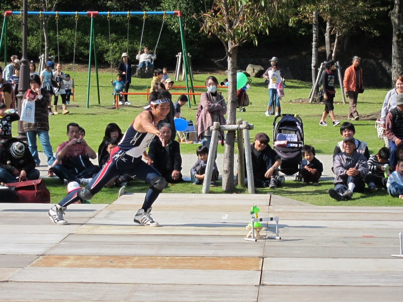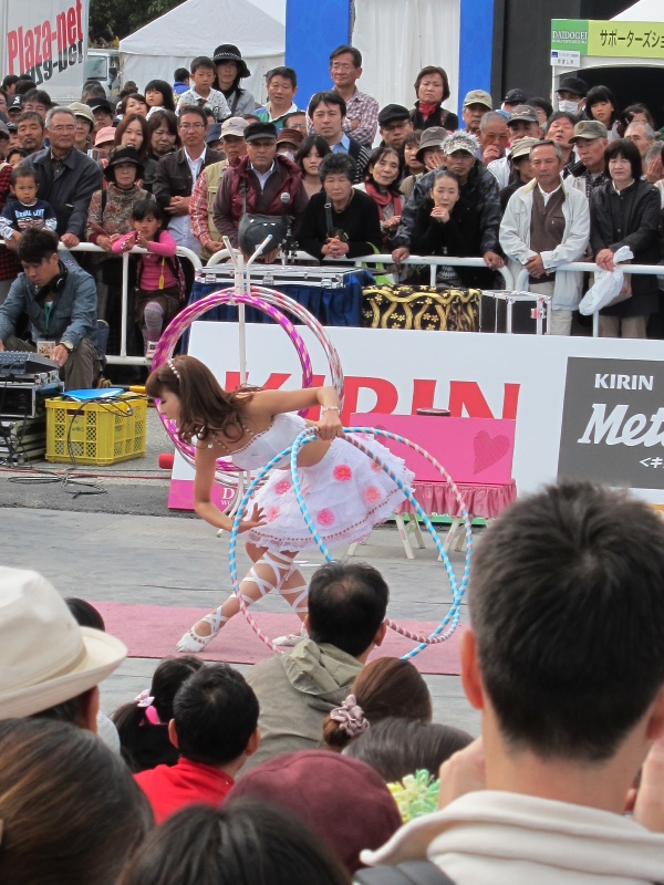 帰り際に、最後の方だけ通りすがった。ジャグリング(クラブパッシングというのかな)だが、「11本」というのは、日本(世界?)新記録とのこと。3〜4回トライして、成功させた。