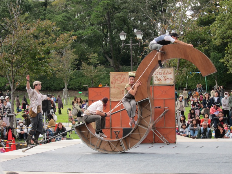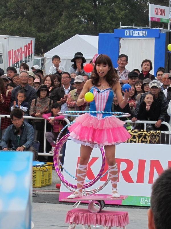 引き続き、富士見芝生広場のとなりのポイントで始まったサーカス団。悪くはないが、期待していたほどではなかったかな。写真でも雰囲気は伝わると思うが、なんか地味なのである。実は難しいことをしているのかも知れないが、それが伝わってこない。難しいことを(そうは見せずに)さりげなく簡単そうにやってしまう方が「粋」だとは思うが、客は驚くために来ているのだから、そういう上品なスタイルは、お門違いだと思うのである [;^J^]。もっと、ハッタリをきかせるべきだと思う。常打ちの小屋に通って、日頃から付き合っている、という状況ならば、話はまったく変わってくるが、こういうイベントでは、いわば一期一会なんだからさ。