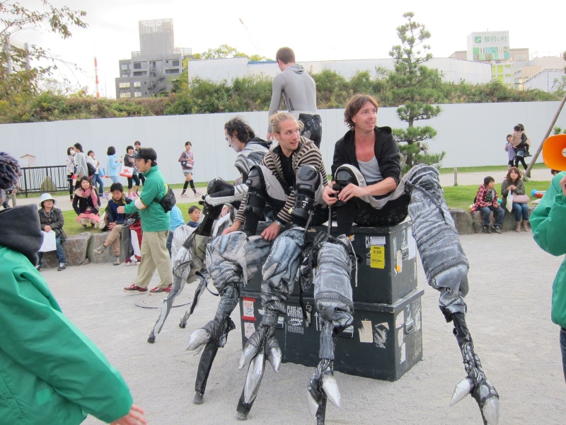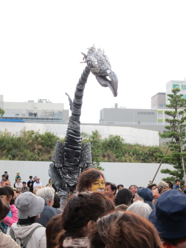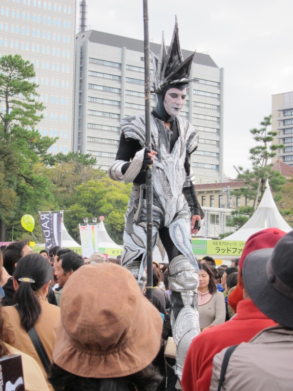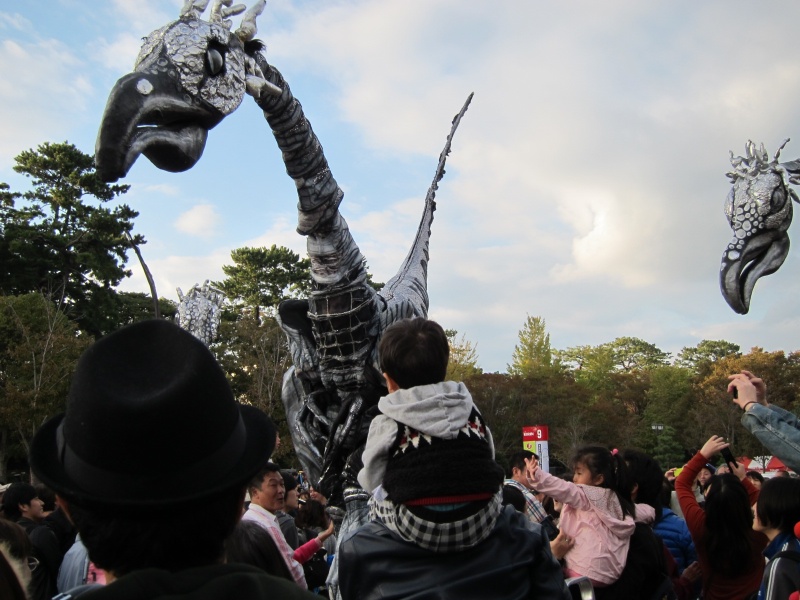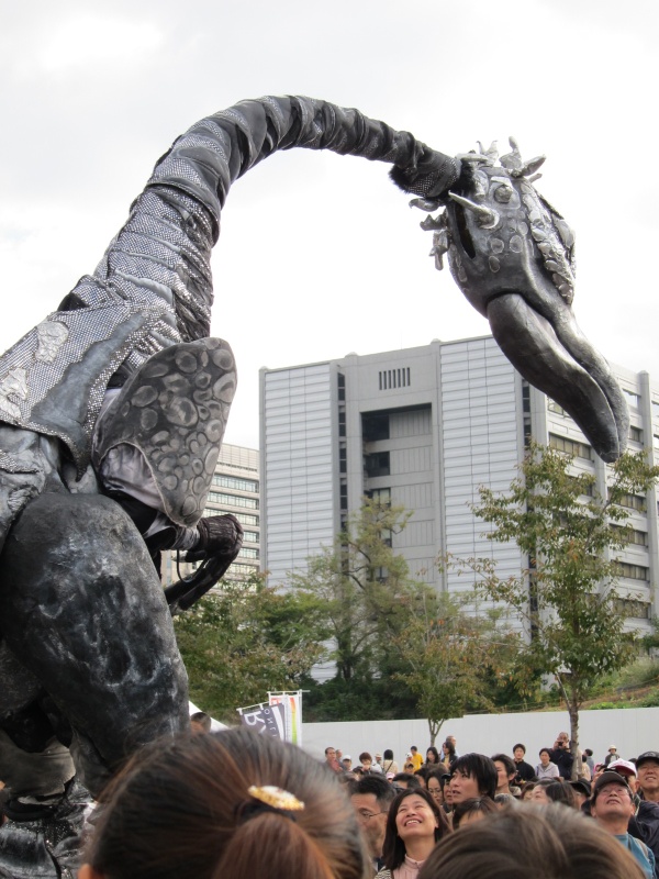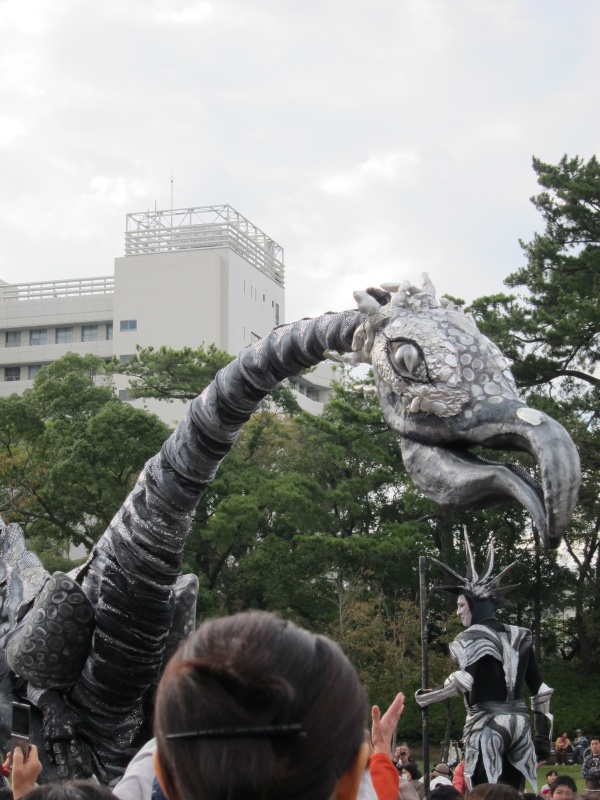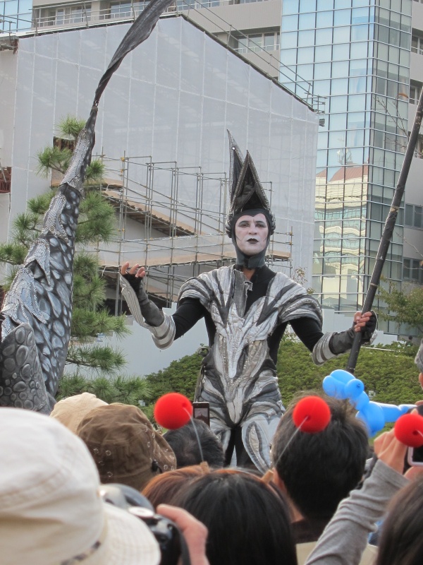 ロービングといっても、駿府城公園内の「富士見芝生広場」広場から出ることなく、パフォーマンスを終えた。昨日は呉服町通りや七間町通りを練り歩いていたはずであるし、公式パンフレットによると、今日もそちらに出没する予定だったのだが、ここ(駿府城公園内の広場)に変更された理由は、わかるような気がする。あまりのインパクトに、人を集めすぎるのである。他のパフォーマーの邪魔にもなろう。