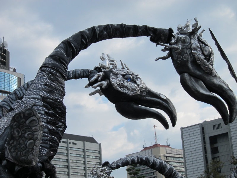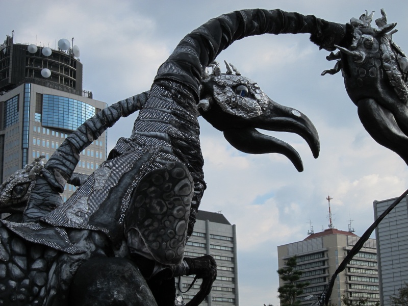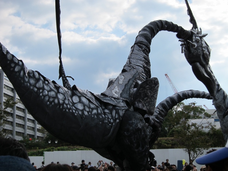 ちなみに、ひでえ写真ばかりだと呆れていらっしゃるであろうあなたに、種明かしをしておこう。この時点で、私は左手に脚立を抱え、右手に生ビールのコップを持っていたのである [;^J^]。この状態でどうにかこうにか写真を撮ったのだから、報道カメラマンの鑑として、誉めて欲しいぐらいのものである。[;^.^](脚立を置いて落ち着いて撮ればいいだろうって? そうはいかない。動き回る恐竜たちに追われて(あるいは追い掛けて)群衆が右往左往しているまっただ中にいるのである。)今日の日記の最初の方に書いた「持ち歩いている当人にとっても、結構、邪魔」というのは、つまりまさにこの状況を指していたわけである。)