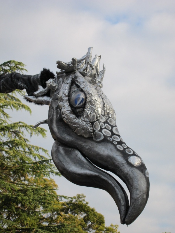 羊飼いならぬ恐竜使いが現れる。彼を含めて、全部で4体(1人+3頭)である。これまで、ありそうでなかった、恐竜スティルト。よくみると普通の布製なのだが、動いているところを至近距離でみると、あまりの迫力に、質感まで錯覚してしまう。