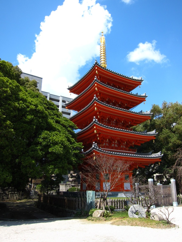 12:25に発って博多に戻り、12:50、東長寺。ここは手持ちのガイドブックではほぼスルーされているが [;^J^]、冬コミで買った博多本で紹介されていて面白そうだったので。全高16メートルの博多大仏とか(小規模ながら暗闇の)地獄めぐりとか、観光スポットとしては、悪くない。(← 罰当たりな文言ですかね。[;^J^])写真は、境内の五重塔。