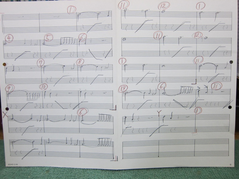 帰宅してから、シェエラザード終楽章のハープグリッサンドRPS譜を作る。(「RPS」についての説明は、省略する。[;^J^])要するに、どのタイミングでどのパッドを叩けば次々とグリッサンドを切り替えていけるかという、専用パート譜みたいなものである。右に写真を載せておく。なぜわざわざこんなものを作るかというと、ここは総譜もパート譜も混んでいて(音符で真っ黒で)進みも早く、総譜に書き込んでもハープのパート譜に書き込んでも、必ず「落ちてしまう(見失ってしまう)」からである。