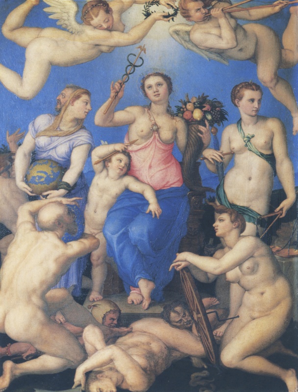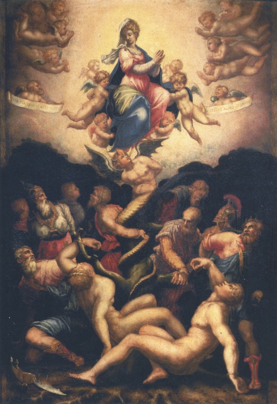 そして、ルネサンス末期の2作。左は、ブロンヅィーノの「公共の幸福の寓意」。右が、ジョルジョ・ヴァザーリの「無原罪の御宿りの寓意」。「公共の幸福の寓意」の、マニエリズムのお手本みたいな(歪んだ)人体表現もすごいが、なんなんだ、この「無原罪の御宿りの寓意」は! 細かい「寓意」の複雑さもさることながら、その構図! ドリルのように樹に巻き付く蛇(悪魔)を中心とする、まるで「花」のような絵画空間!