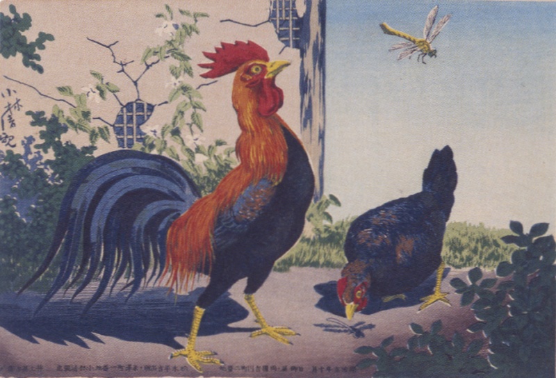 夜景ばかりではない。いずれもスキャン品質が低いのが悔しいが、いずれにせよ、これらは本物を観てもらわないと、真価がわからないよなぁ..左図は「猫と提灯」、右図は「鶏にトンボ」。「猫と提灯」の、猫の毛の表現が素晴らしいのだ。