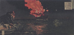左の「薩た之冨士」は、高速バスで上京するときに良く観られる風景なので、その意味でも親近感がある [^J^]。右の「朝鮮豊島海戦之図」は、日清戦争を素材とする戦争画。このジャンルも、いくつか出展されている。