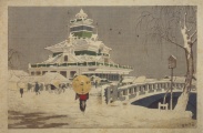 というわけで、今夜の日記では、先週から展示されているもののうちから、紹介しそびれていた佳品をスキャンしておく。(元画像が小さかったり、絵葉書だったりするものもあるので、画質についてはご容赦。[_ _])左図は、「海運橋(第一銀行雪中)」、右図は「東京新大橋雨中図」..なんかもう、言葉にならない。
