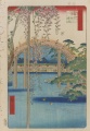 左図は、小林清親の「武蔵百景之内 品川見越ノ月」。おそらく、前記広重の「月の岬」にインスパイアされている。個人的には「月の岬」の方が好きなのだが、とにかくこの作品は、その技巧に魅了される。そして、右図、歌川広重の「名所江戸百景 亀戸天神境内」は、格別に惹かれた作品というわけではないのだが..背景の空がおかしいと思わん? 太鼓橋の下だけ青くて、その外側(上側)は白いのである。アシへの指示忘れ、編集のチェックもれとしか見えず、締め切り間際(というか恐らく既に締め切りをとっくに過ぎている)修羅場が目に見えるような..← だから、マンガじゃないってばっ! [;^.^]