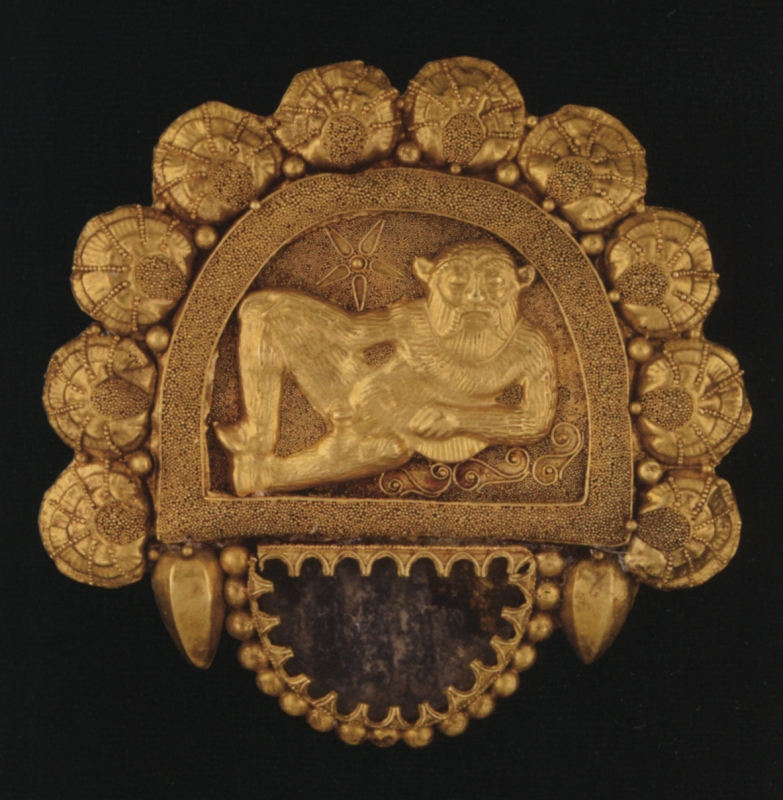 そして、これが究極! 「横たわるシレノスが表された飾り板」(紀元前480年頃、エトルリア)。高さは、僅か5cmもないのである。拡大して注視してみて欲しい。「粒金」というより、もはやほとんど「パウダー」に近い。どうしてここまでやらなくてはならないのか、意味がわからない [;^.^]。技術のための技術というか、技巧のための技巧というか..恐らく、職人たちの「競争」があったのだろう。誰が一番細かく作れるか、という..そしてここで、私ならではの暗い想像(幻想)に迷い込んでしまうのだが..このいわば「技術オリンピック」に破れた職人は、殺されたのではあるまいか..古代の王ならやりかねない..などと書くと(いかにも「古代」に対する目線がワンパターンで)いささか問題だとは思うが、しかしそういう想像力の暴走を喚起するほどの、「命懸け」の迫力(凄み)が放たれているのである..(そしてそれは、jpegファイルでは、伝えられない..)