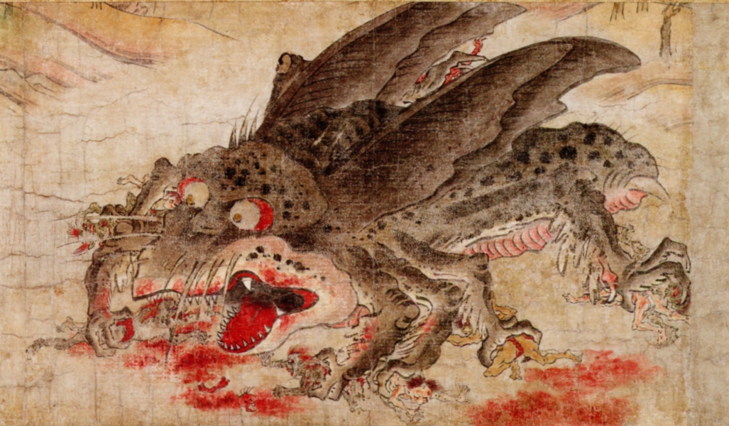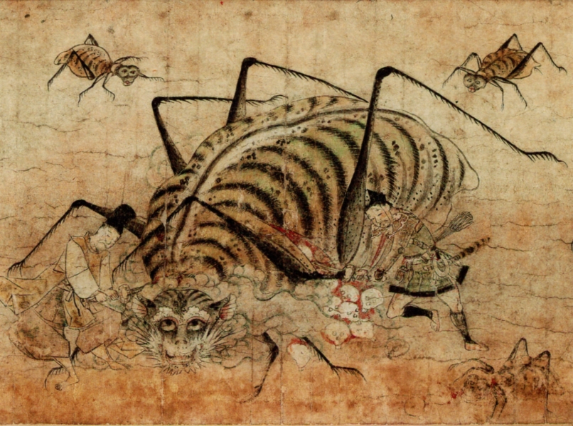 右に紹介する2点は、非常に観たかったのだが、残念ながら、大阪では展示されないようである [;_ _]。左図は、「辟邪絵 鍾馗・神虫」の「神虫」パート。右図は、「土蜘蛛草紙絵巻」の「土蜘蛛」図。右図は、後期に巻物の巻き替えがあれば、あるいは観られるかも知れないが(現在、別のシーンが展示されているのである)、展示リストには、巻き替えをするとは書かれていない..