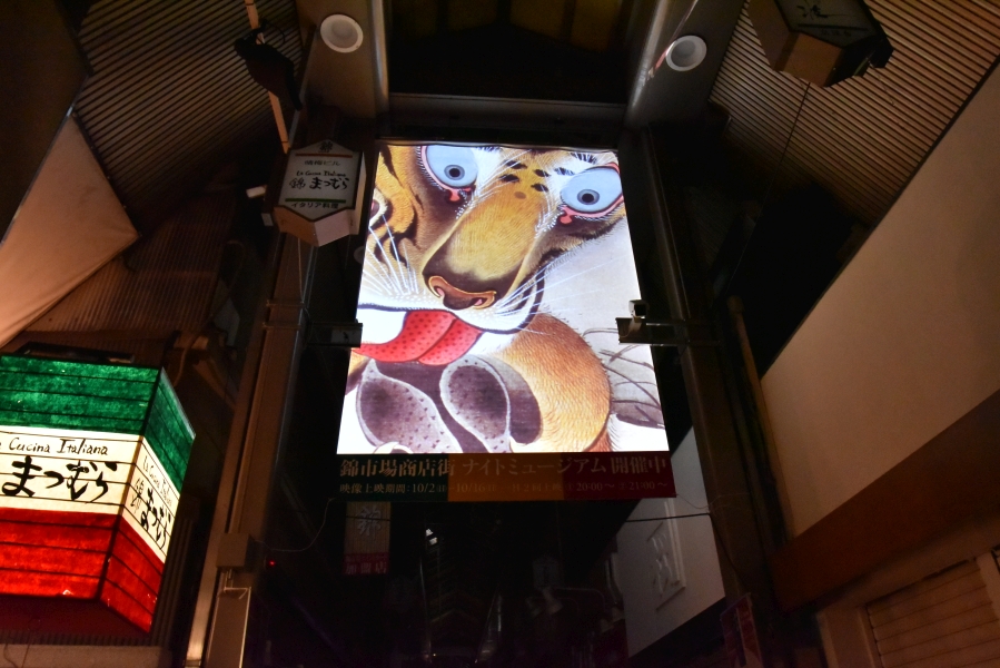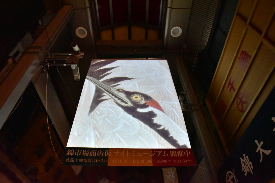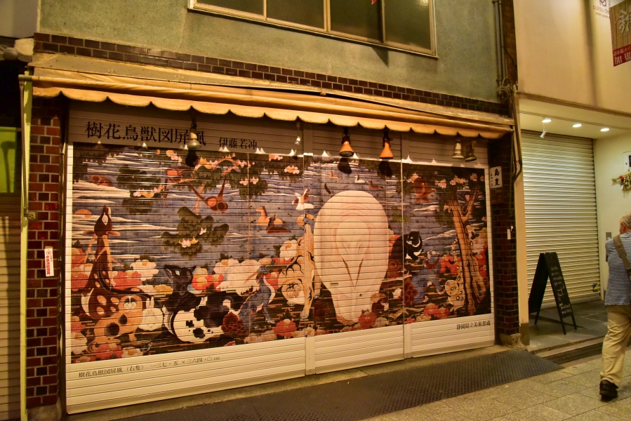 いったん京都駅に出て(徒歩10分ぐらい)、地下鉄で2駅先の四条駅で降りて、数分歩いて、18:40、「錦市場」。若冲ゆかりの地では、今、若冲とのコラボ(シャッターにペインティングしてライトアップとか、ビデオ作品の上映とか)をしているのである。(いつまでやっているのか、手元のガイドブックに情報がない。自分で調べてちょうだい。)