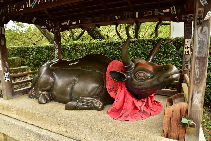 空が白いが、これは昨日の写真の空のように、飛んでいるわけではない。元々本当に色も立体感もない曇天なのである。そして、菅原道真とくれば、牛である。(ほぼ、妖怪化しているが。[;^.^])