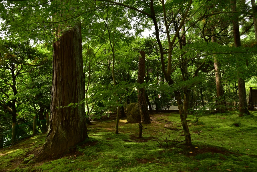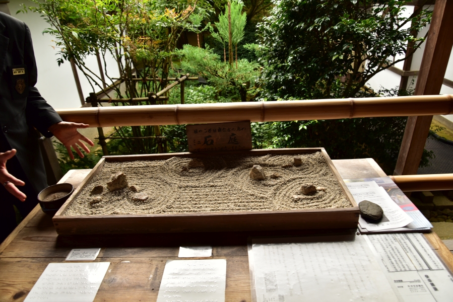 左から、「鏡容池」、庫裡への途上の林、石庭の模型。