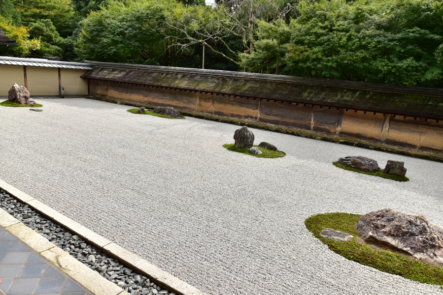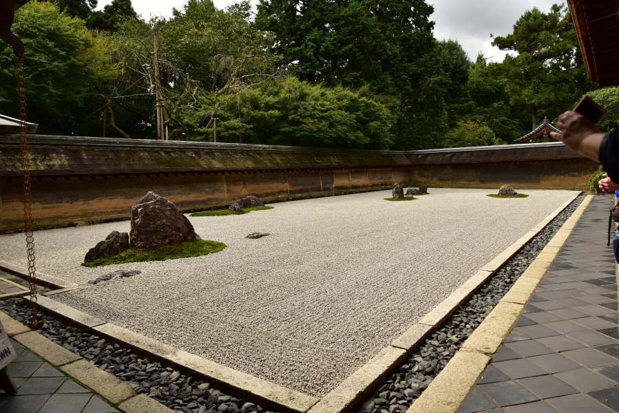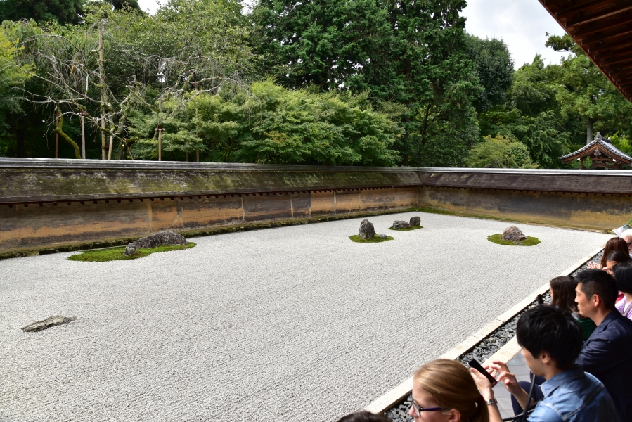 左の写真は、ホワイトバランスを間違えた。中央の写真は、ホワイトバランスは合っているが、混んできたので、全貌を収められない。右の写真..ま、見学者も含めての石庭だ。[;^J^]
