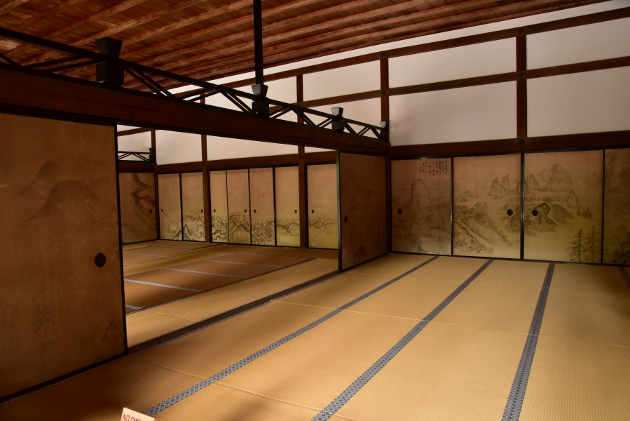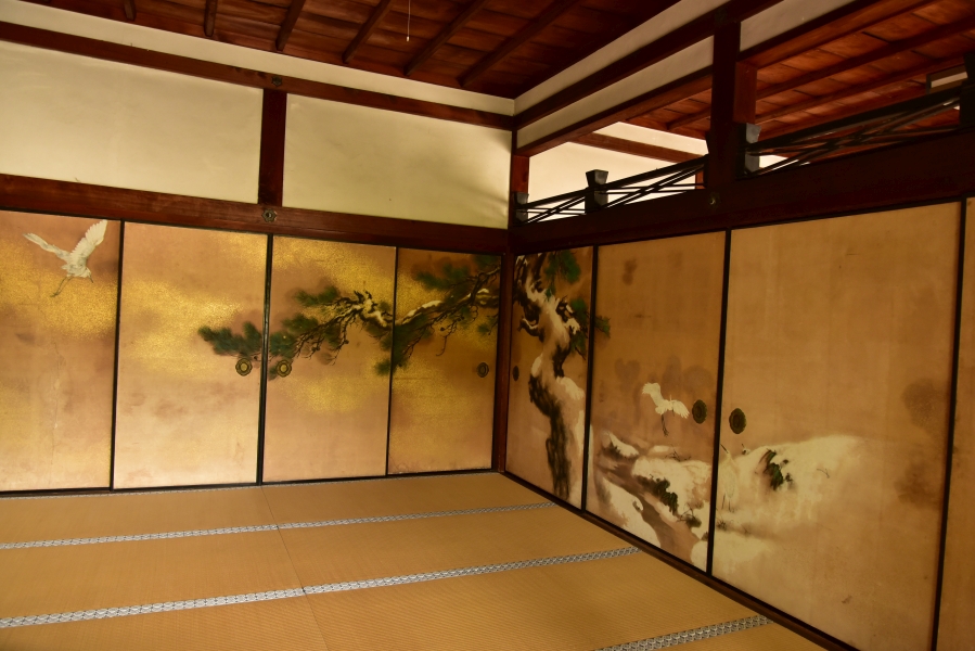 書院では、日本最古の北能舞台もさることながら、面白かったのは、やはり南能舞台。すぐ近くから見ると、奥の方の松の絵は闇に沈んでいて全く見えないのだが、この能舞台に正対している書院の部屋の奥の方に引っ込めば引っ込むほど、松の絵がくっきりと浮かび上がってくるのである。光(のコントラスト)のトリックであるが、これは素直に素朴に面白いと思った。