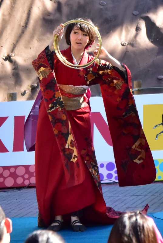 ヨーヨーを操るナオト。まことに申し訳ないことながら [_ _]、ここでは注意力の半分以上を、カメラに持って行かれてしまった。つまり、日中の天平と同じく、「シャッター速度優先AE(オート露出)モード」で撮ってみたのである。シャッター速度は1/50秒。特段、ヒカリモノもない、安定した光源の元で行うパフォーマンスだから、これでうまく手から先だけブレさせることができるだろう..とかなんとか、ほとんど邪想念の塊だったものだから、結果としてパフォーマンスをちゃんと観ていないし、写真も駄作だし..という、一番、ダメなパターン [_ _]。ナオトにも失礼である。反省。[_ _]
