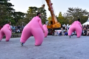 ここで、16:30から18:00まで、連続3組が演じるエアリアルをかぶりつきで観るべく、富士見芝生広場会場の最前列に、1時間前(15:30)から地べたにあぐらかいて座っていたのだが、1時間も空けておくのはもったいないという主催者判断か、なんと、プログラムにはない、「カンパニー ディディエ テロン」のパフォーマンスが、急遽、差し挟まれた。得した得した [^J^]。基本的にはストリート系、街中でハプニングを起こす系らしいのだが、ここではステージで、シアターモードで..