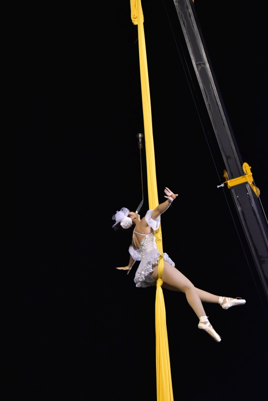 エアリアル(ロープやカーテンやときにはブランコを空中から下げて、それに乗り(多くの場合上下移動し)、宙を舞う)だが、極めて珍しい男性ソロである。(普通は女性。男性がやるとしても女性とのデュオである。)それは、肉体のしなやかさ/美しさをアピールするジャンルだからであるが..彼の肉体がまた、実にしなやかで美しいのである [;^J^]。タイ人だからという先入観は持ちたくないが、それはほとんど無理な相談に近い、美しさ..[;^.^]
