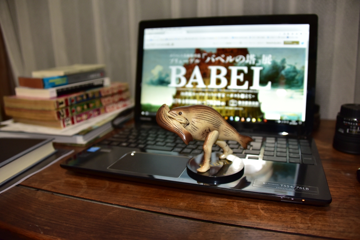 「バベルの塔」展で保護してきた公式フィギュア(「大きな魚は小さな魚を食う」の左端の方にいる奴)の記念撮影。左写真は、ひとりでおすまししてるとこ。「なんやなんやこいつは」、と、実家の先住民たちがわらわらと集まってきたところを撮ったのが、右写真。