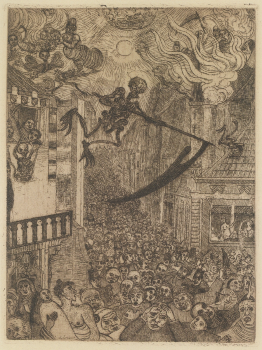ジェームズ・アンソールも、多く来ている。左図、「愛の園」は、知らない人も多いだろう。アンソール作品として誰もが連想する“仮面”や“骸骨”とは、やや趣を異にする作品だが、私は好き。国内にあるせいか(豊田市美術館)展覧会で見かける機会は、案外ある。右図、「人々の群れを駆り立てる死」は、アンソールの堂々たるメインストリームというか [;^J^]、非常に有名な作品である。