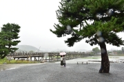 左写真は、渡月橋。レンズが雨粒で濡れている [;^J^]。橋を渡って桂川沿いを歩き、亀山公園の頂上展望台を目指す。中央写真を経て、保津峡を望む右写真。10:00頃に着いたんだったかな。