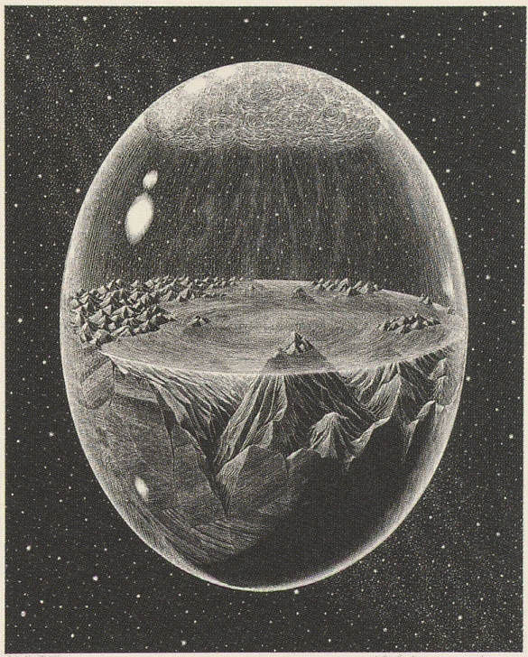 そしてなんといっても異様なのが、巨大すぎる「月」と、その前に浮かび上がる「寺塔」である。夢の中でしか存在しえない情景..その闇と光..しかしこの「月」は、「洞窟の出口」にも見える瞬間があり、そのとき、この街を覆う闇の(空間の)意味が、逆転する..この蠱惑的な「幻想の街」は、いったい、どこに存在するのであろうか..