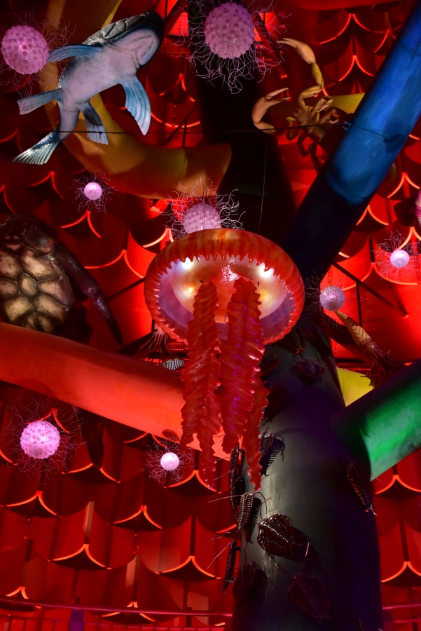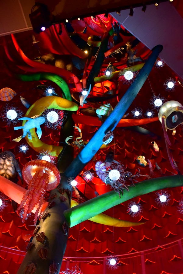 「生命の樹」の足元には、ポリプ、ウミユリ、べんもう虫の群れ。美術的には、ここが一番面白い。また、写真撮影ができるのは、この基底部のみ。16名全員が携帯などをしまうまで観覧ルート(螺旋階段)を案内してくれないのは、理解できる。上からスマホなどを落としかねず、人や展示物を傷つけてしまう可能性があるからである。