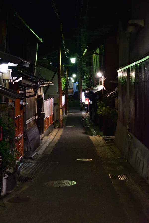 お店はお任せである。少し驚いたのだが..ほんの数分間歩いただけで、いきなり人気(ひとけ)が無くなる。既に暗いとはいえ、まだこの時刻なのに。さらに言えば、今歩いているところは、興福寺の境内なのである [;^J^]。塀が無いのだ。京都ではありえない。これに比べると(京都の)西本願寺などは、城塞である [;^.^]。無論、奈良に来たことは数年前に何度かあるし、興福寺も訪れているのだが、それは昼間のことであって、夜にはこういうありさまであるということに気がついていなかったのである。