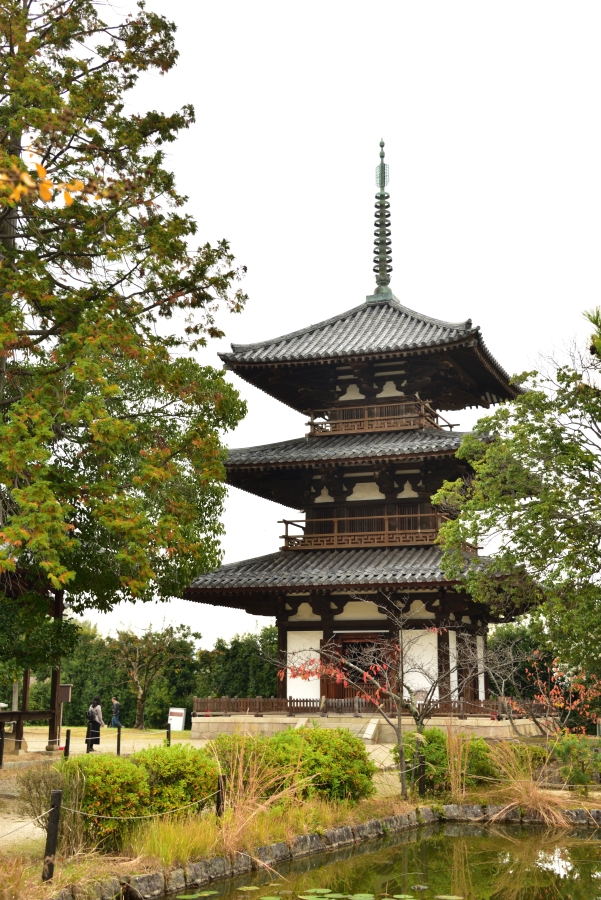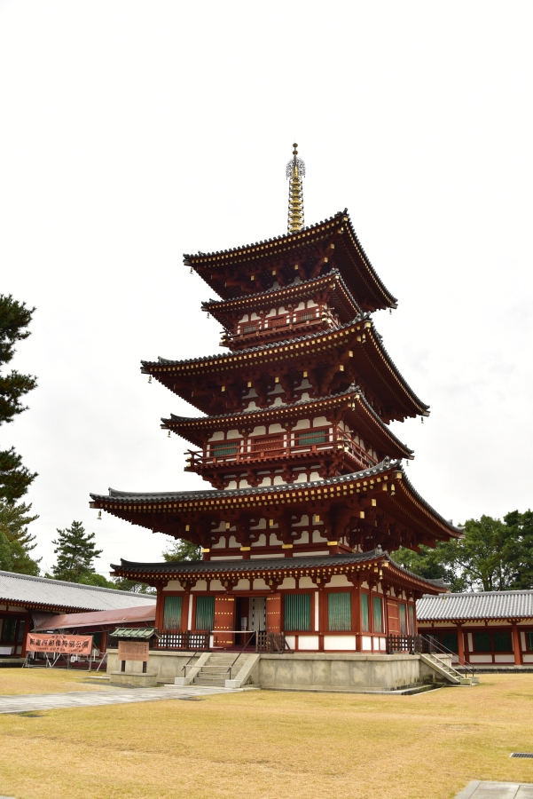12:45、薬師寺。以下、観た順に書いておくと..食堂(じきどう)の壁画、大講堂の仏足跡など、金堂の薬師三尊像(素晴らしい)、東塔は解体修復工事が終わって覆屋を取り外している最中(ほとんど終盤である)、西塔(左写真)、東院堂の聖観世音菩薩像..北拝観受け付けから入って、以上の順に観たのだが、どうも「裏口」から入ったっぽく、「順路」が「逆」で、非常に合理的でない経路を辿ることになった。[;^J^]