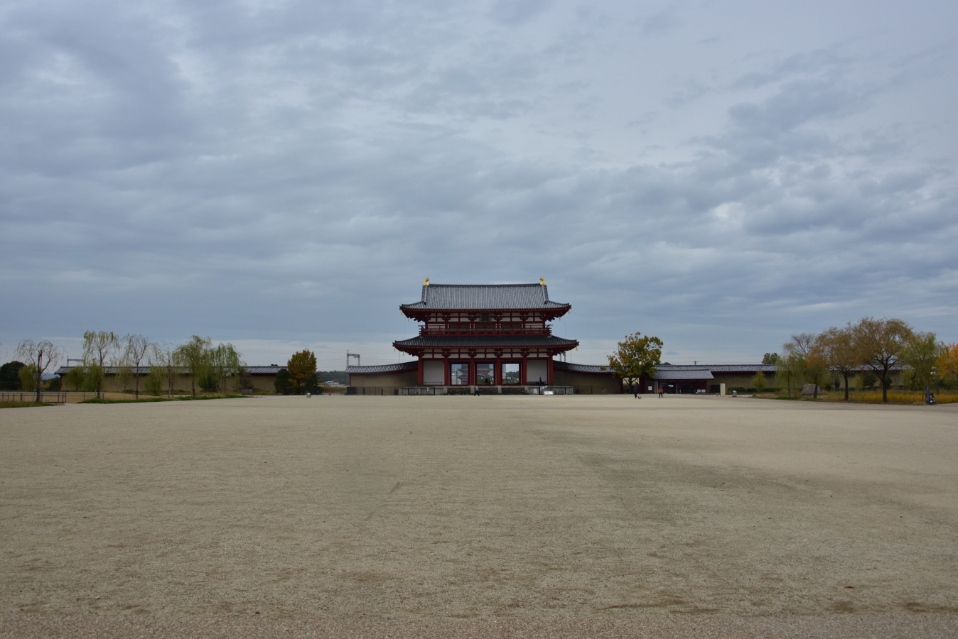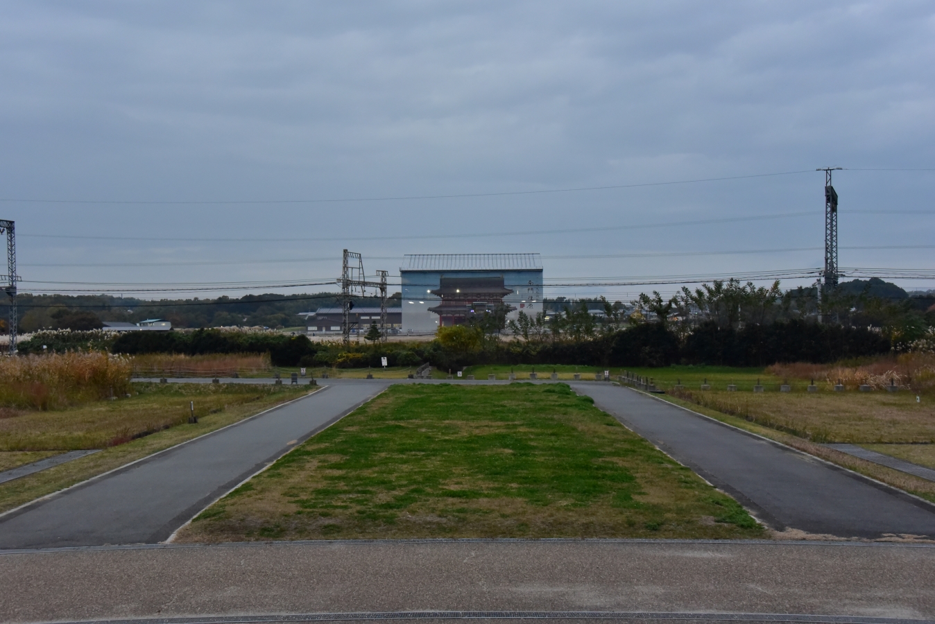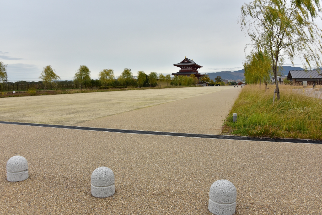 16:20、朱雀大路(の復元であるところの、広場)を歩いていたら、ついにポツポツと小雨が降ってきたが..傘が必要なほどではない。カメラのレンズにつく水滴をときどきぬぐいつつ、朱雀門まで歩くが..