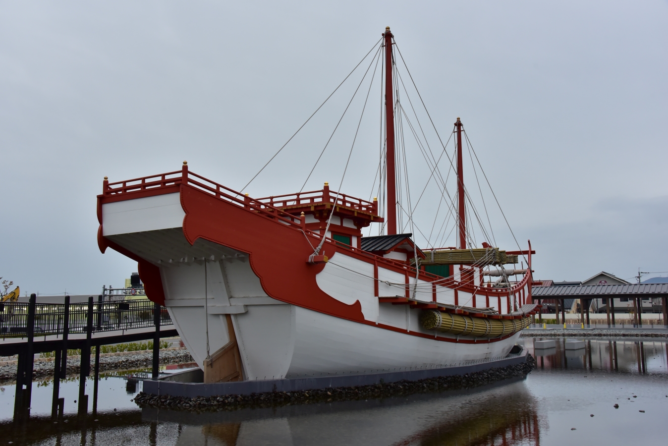 まずは、例によってここからの離脱方法を、レンタサイクルの窓口にいたスタッフに訊く。17:22に、ここを発つ最終バスがある。OK。ノー問題。さっそくバス停の場所を確認..遠いな [;^J^]。を? 遣唐使船がある!? 私はこういうのに、目が無いのだ [^J^]。「全然記録が残ってないので本当のところはわからないけど、たぶん、こんなもんだったと思うよ」、というエクスキューズ付き [^.^]。いいね、いいね [^J^]。もちろん、「乗船」する。船室に入れるともっと良かったのだが..(まぁ、何もない、ただのガランドウの空間なのだろうが。[;^J^])