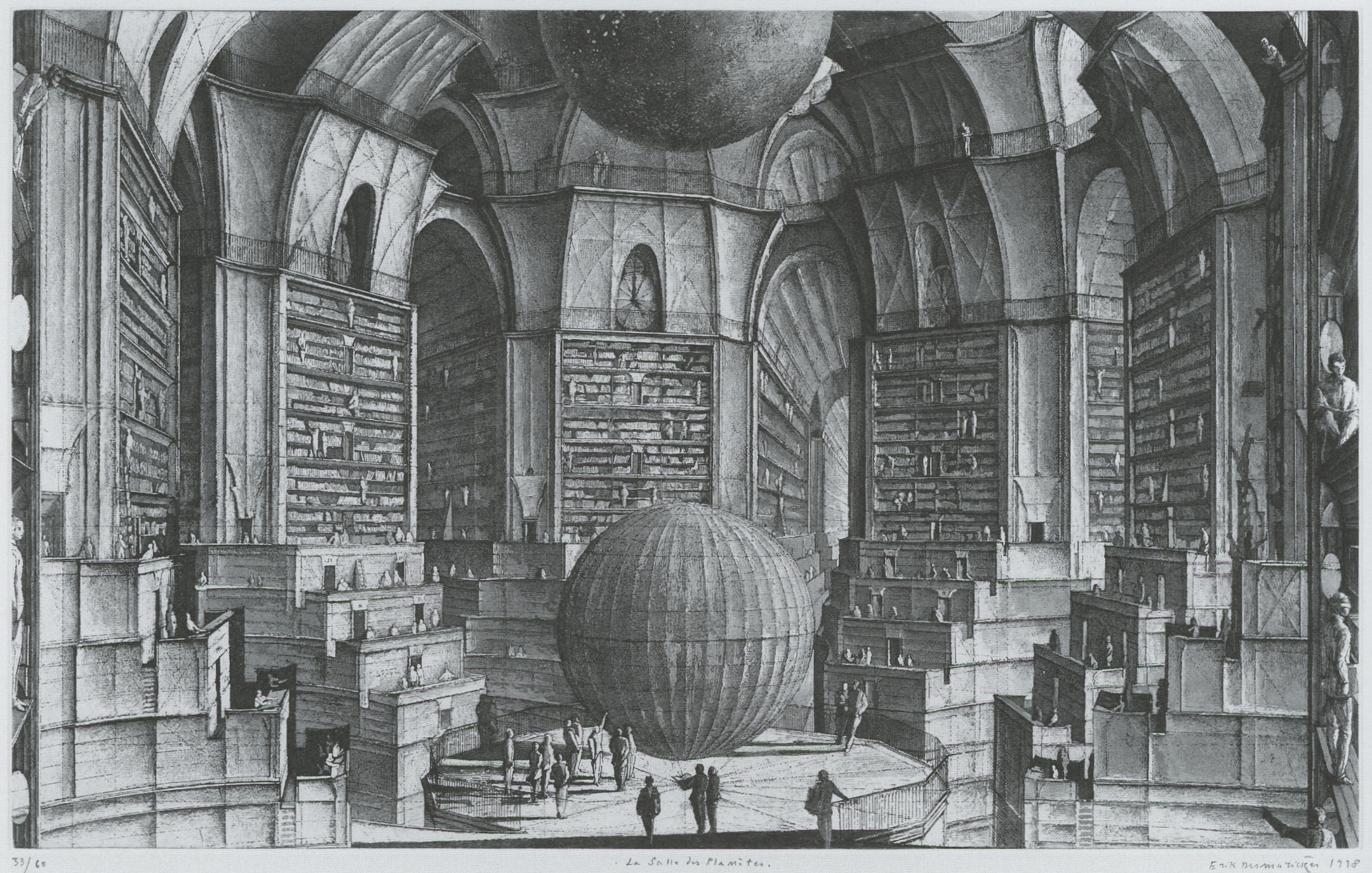 左図は、「上から見下ろす(No.4)」。右図は、「惑星の部屋(No.5)」。一見して、原作小説とは明らかに描写が異なることがおわかりだろう。ボルヘスの「図書館」を構成しているのは、比較的小さいサイズの六角形の無限の連続であるが、デマジエールの連作においては、六角形にとらわれぬ、極めて広大な空間が描き出されている..