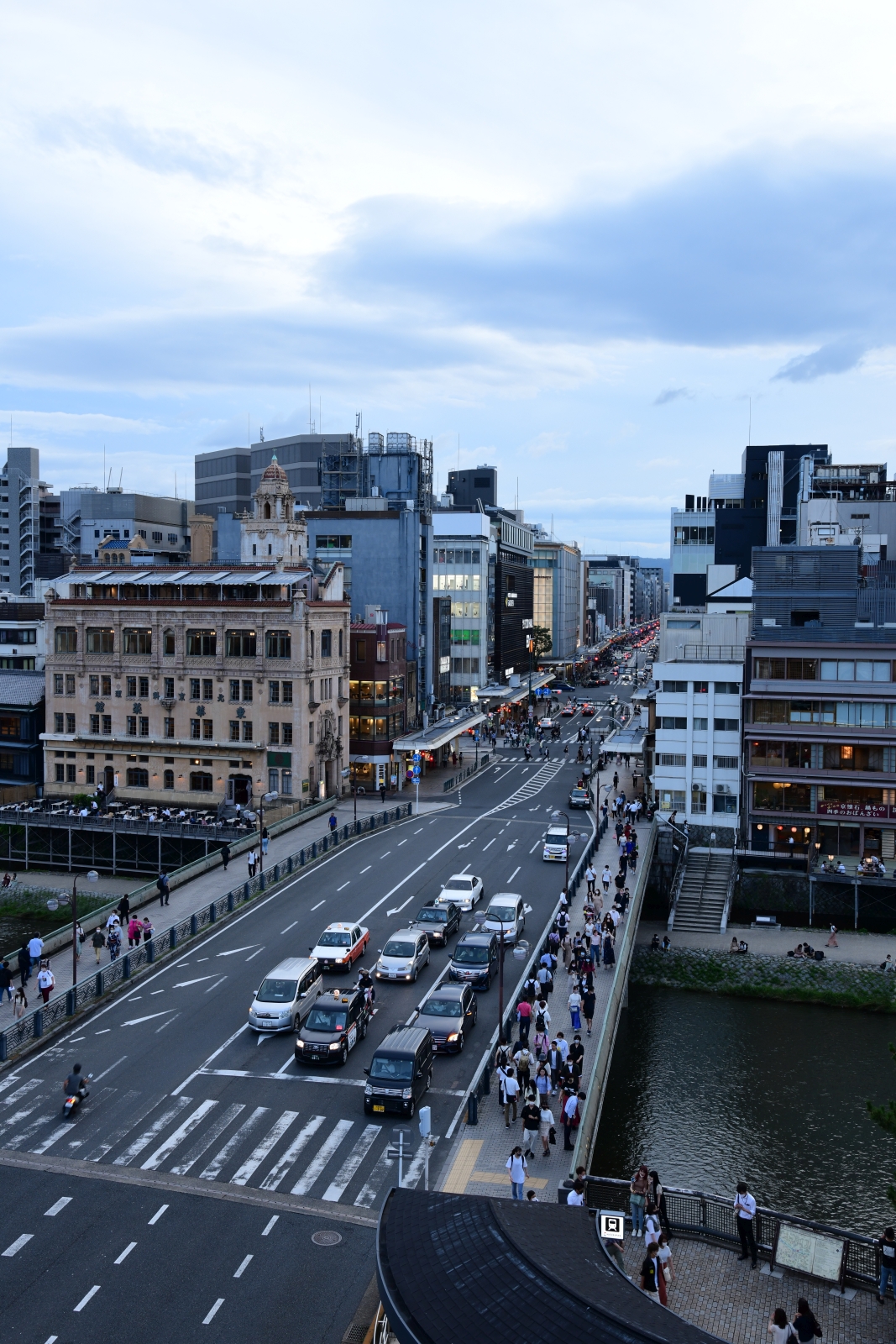 わりとすいているので、邪魔をせずに写真を撮れるのはありがたい。左写真は鴨川の下流方向(南側)を眺めやる。次の写真は四条大橋。河原町方面を臨む。その右は鴨川の対岸、納涼床。等間隔で座っているカップルは..この写真の中には一組だけか。一番手前はBLか。右写真は、反対側を向いて、祇園の街並み越しに八坂神社の楼門。