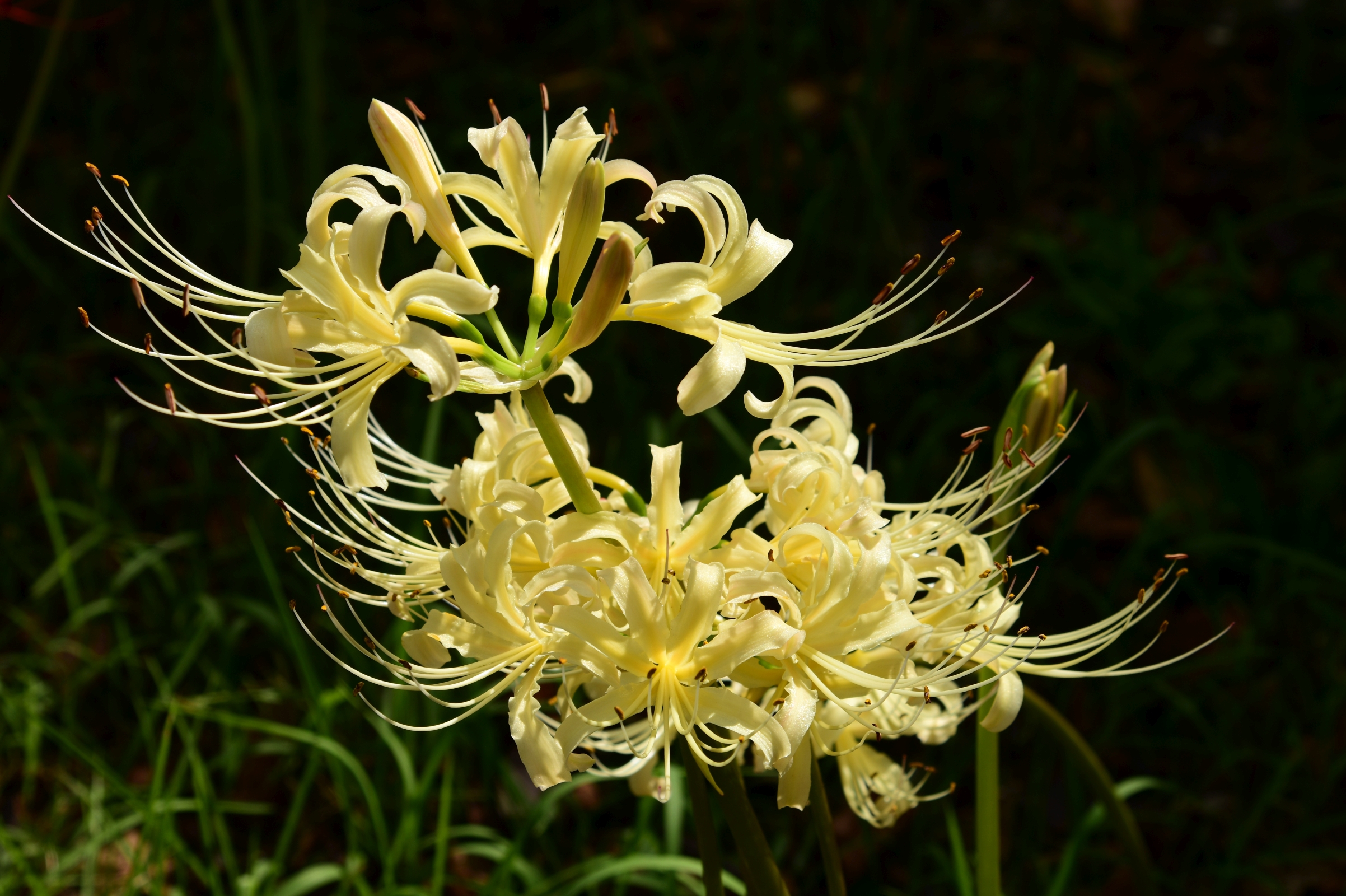 右端の写真の彼岸花は、いくつか融合して、ムカデ型のクリーチャーのように見えなくもない。