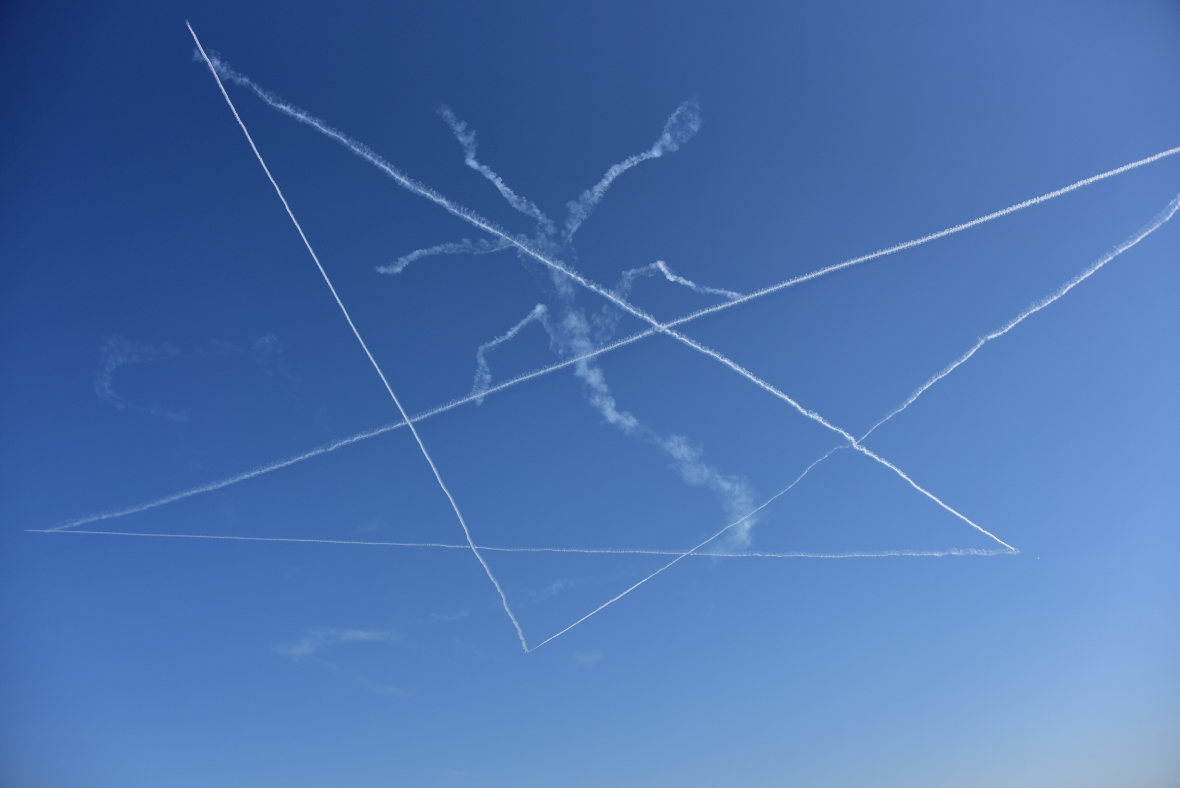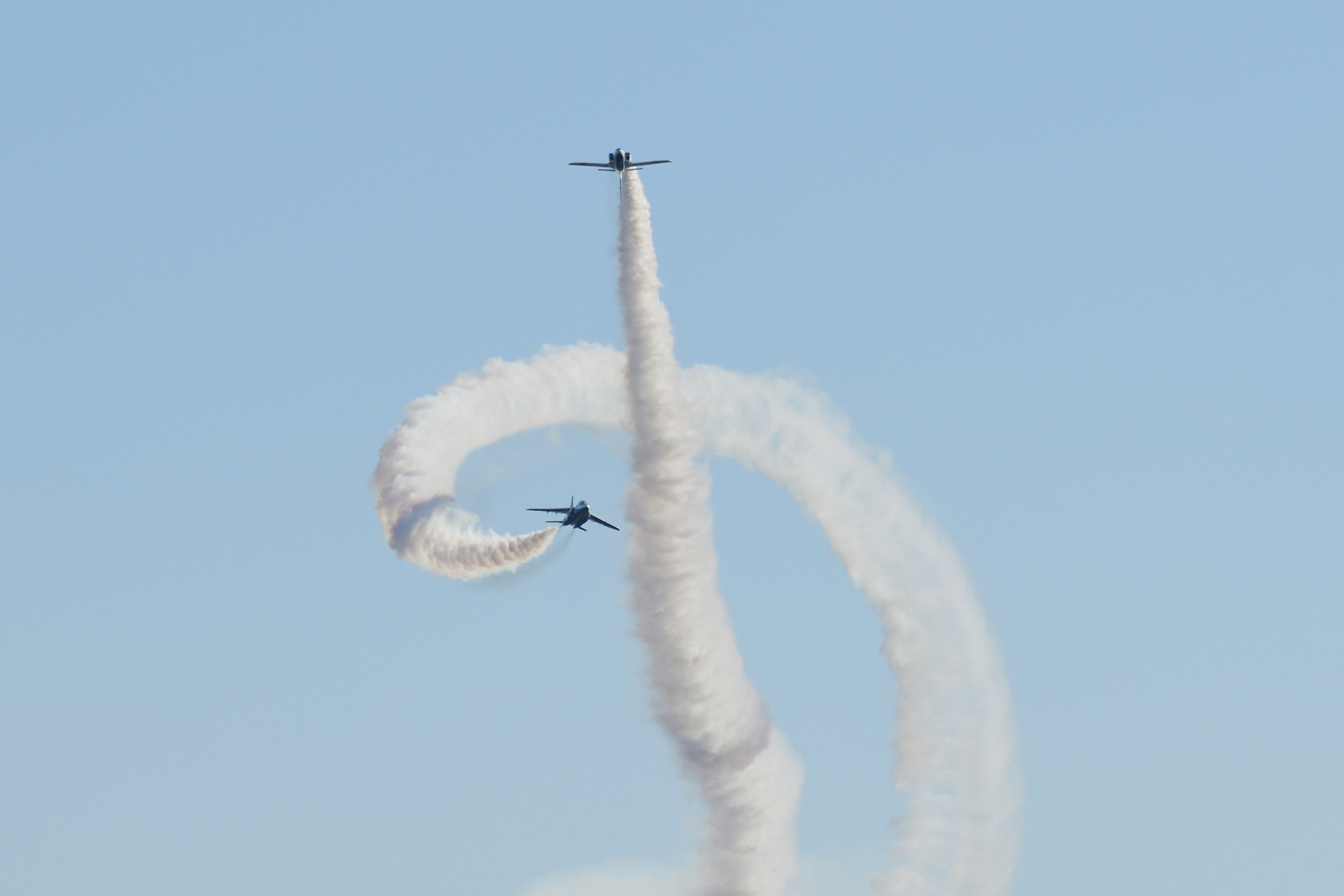 左写真は、有名な「キューピッド」。ハートを射抜く「矢」を演ずる機体の、スモークを「いったん止める」タイミングはまだともかく、「スモークを再開する」タイミングの完璧さに驚く。