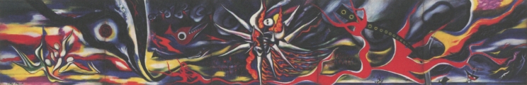 岡本太郎の最高傑作、「明日の神話」の最終形(完成形)は、もちろん、渋谷駅に展示されている壁画(画像検索結果)なのだが、この展覧会にもってこれる訳が無く [;^J^]、出展されているのは下絵である。下絵は4枚あるらしいのだが、これは最後の4枚目(1968)で、下絵としては最大の、横幅11メートル(実物の1/3サイズ)。