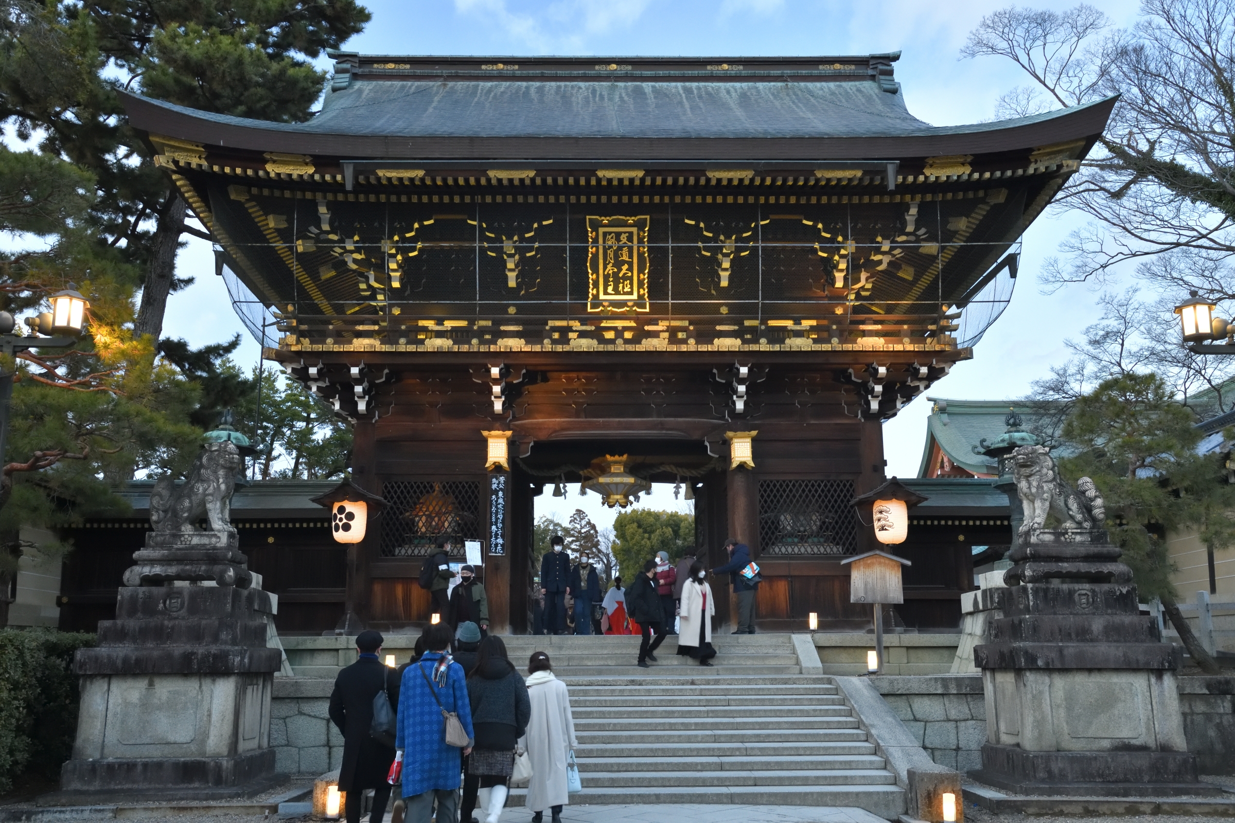 15:55に発ち、バスで16:45、京都駅。今日の宿に先にチェックインしておいて改めて京都駅のバスロータリーから出かけようかと思っていたのだが、往復30分以上はかかるだろうし、時間がもったいないので、このまま京都駅前のバス停から17:00の便で、17:35、北野天満宮前。北野天満宮 梅苑ライトアップ(3月19日まで)である。