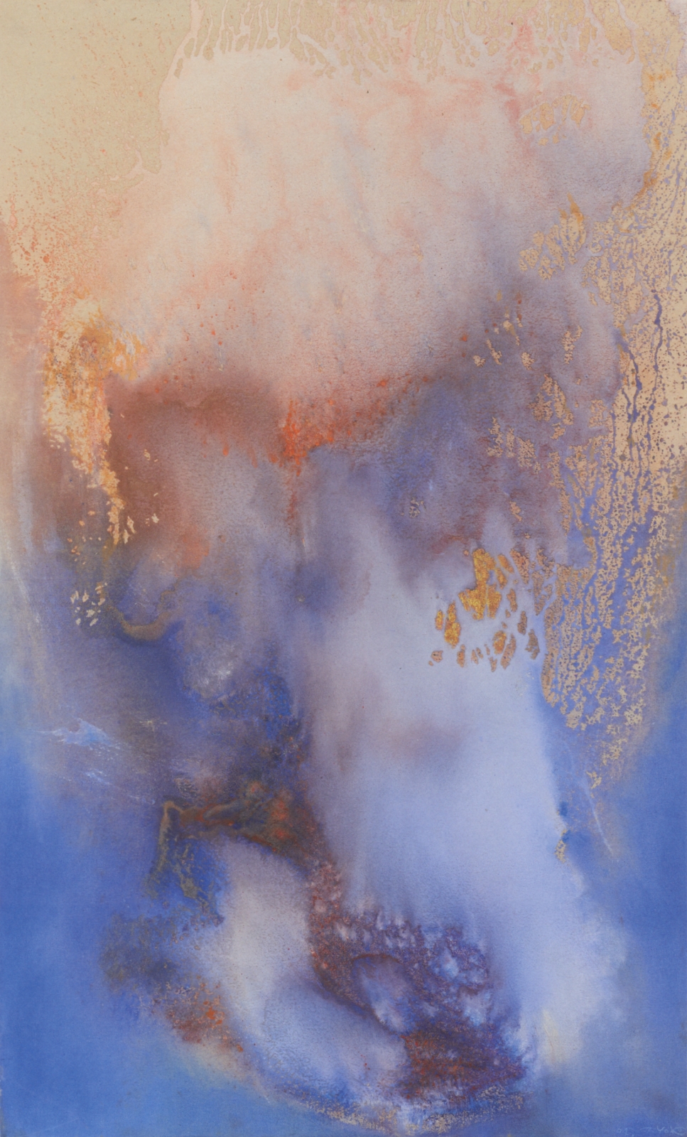 やがて、具象的な形態は姿を消し、抽象表現に舵が切られる。また、日本回帰というよりは、東と西が融合した世界を描くようになる(左図「臥龍」(1988))。そして、アクション・ペインティングの世界に入って行く(中図「青い風」(2003)、右図「アポカリプス」(2004))。