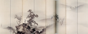 酒井道一の「瀧図」は、ちょっと意外な趣向。彼方に見えている滝には「流水」であることを示す線もしぶきもいっさい描かれず、単にスタティックな「白い領域」が見えているだけ。手前の岩にのみ、流水がぶつかって二手に分かれているところが描かれており、このふたつを組み合わせて初めて「滝」ということがわかる。遠方の「滝」は、そこに動きが描かれていないがゆえに、どこかこの世ならぬ「彼岸の幻影」のごとくである。