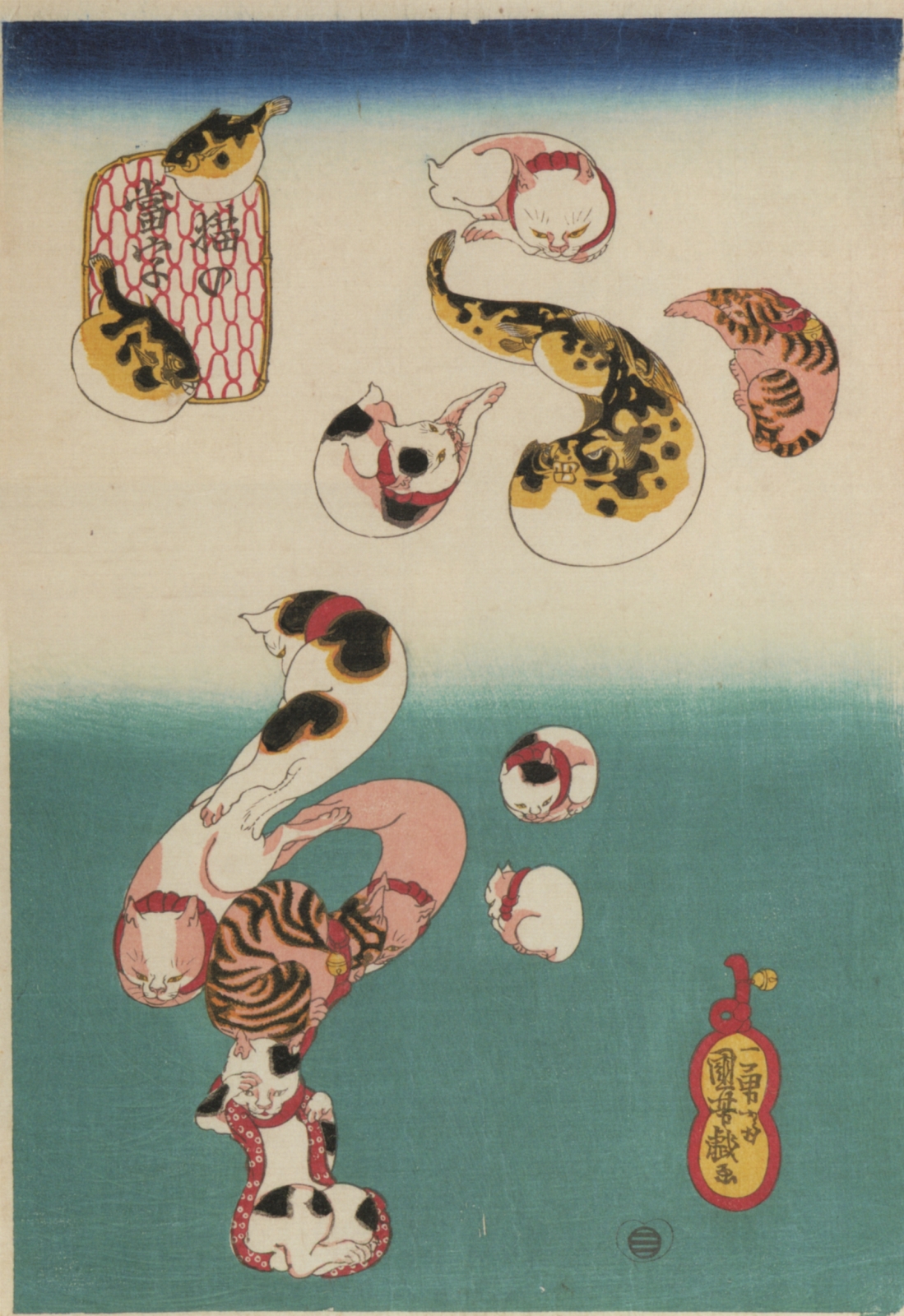 左から、歌川国芳の「猫の当字」シリーズから「かつを」と「ふぐ」。もう、めっちゃ可愛いやん![*^.^*] 同じく「五拾三次之内猫之怪」。これは、先週号でご紹介した「浮世絵の中のいきものたち」@平野美術館にも出展されていた..というかこの作品に限らず、この両展覧会でかぶっている作品は非常に多いのだが、あまりに煩雑になるので、いちいち指摘しないしリストアップすることもしない。