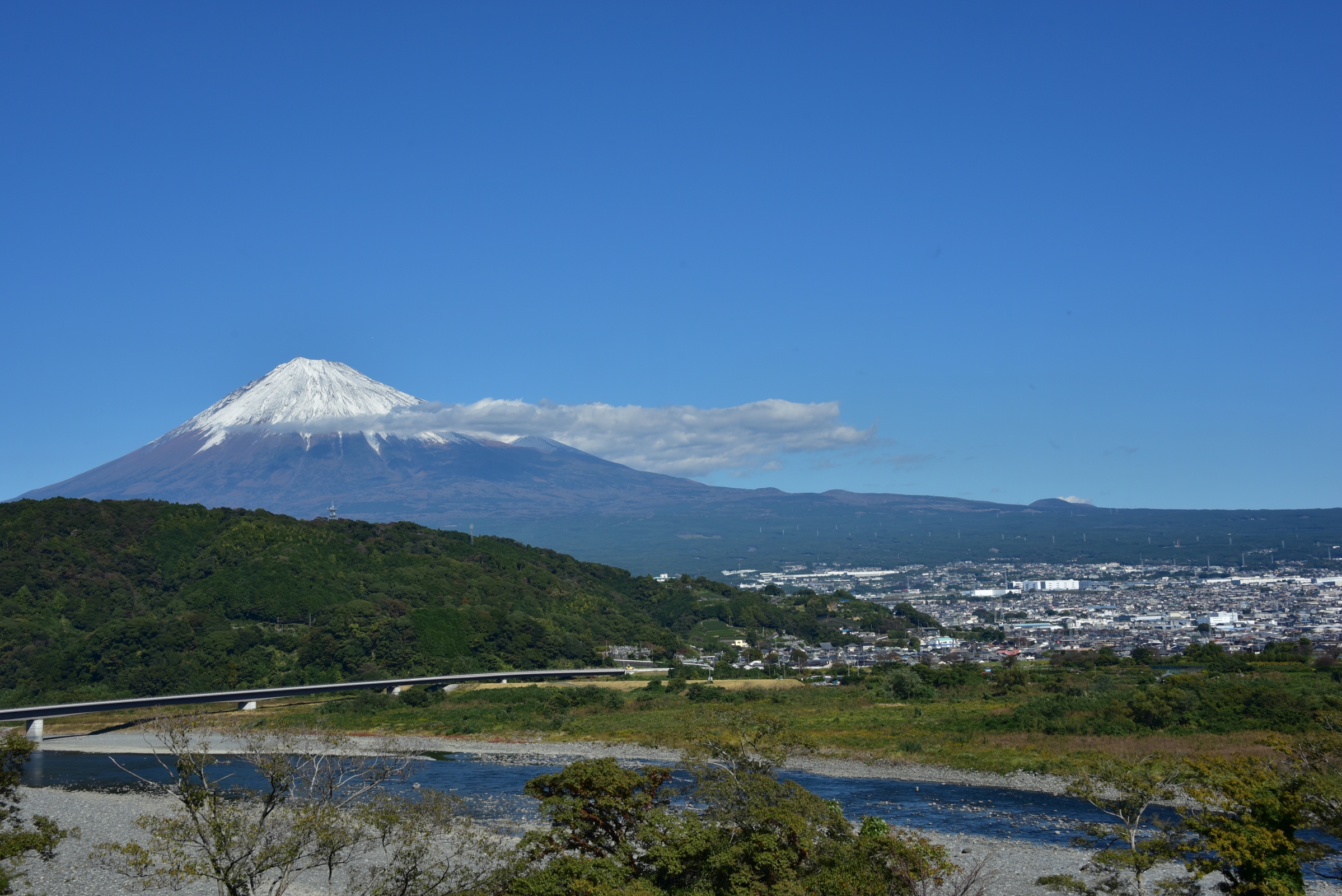 11:22、富士川SA。今日は快晴、一眼レフも2台ある [^.^]。「パノラマレストラン駿河路」で「桜えびかき揚げ御膳」をいただいたあと、絶好のコンディションの富士山の撮影に勤しむ。