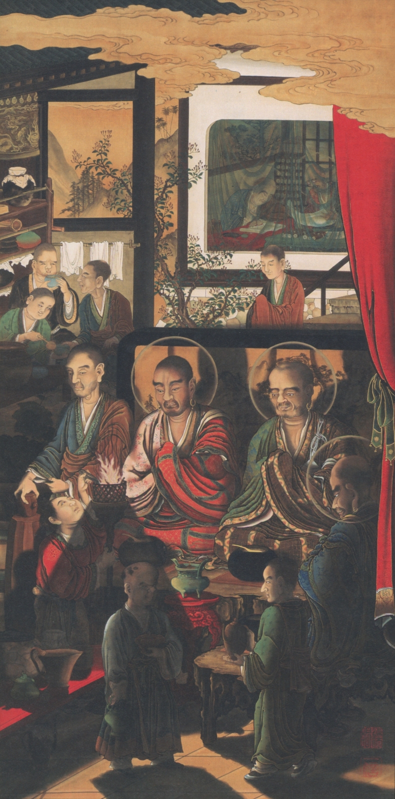「第1章 幕末の江戸画壇」からは、まずは狩野一信の「五百羅漢図」。全百幅から、本展に来ているのは6幅。左から順に、第21、22、45、46、49、50幅である。(できれば、「幻想美術選:五百羅漢 第22幅 六道 地獄」もご一読ください。)右端は、谷文晁の「楼閣山水図」。
