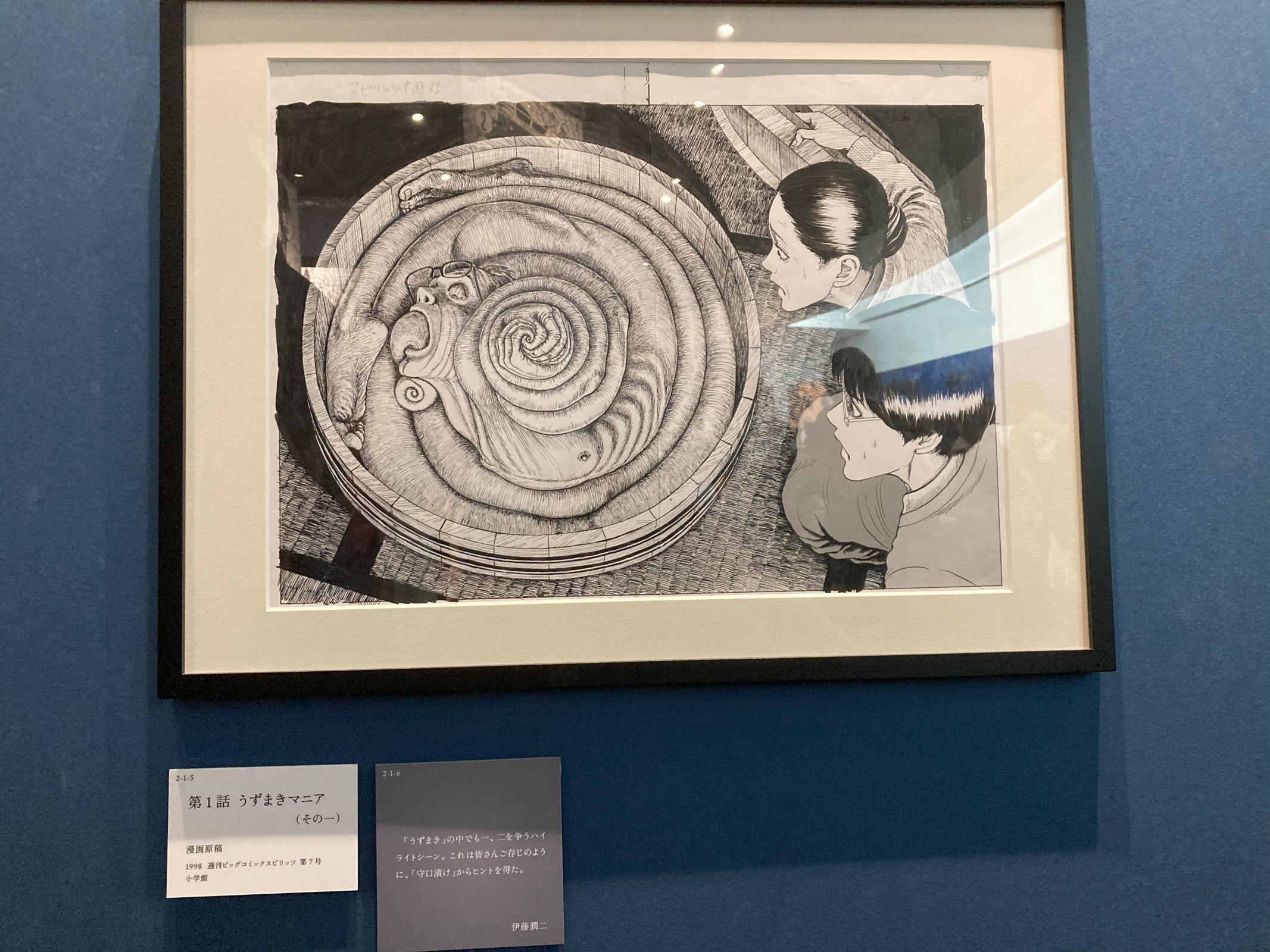 チケットを購入してからさらに15分並び、11時に入場。撮影可。カラー原画のいいのがいっぱい展示されているが、きりがないので、これだけ。スタチューも面白い。伊藤潤二の愛読書(というか伊藤潤二を「作った」書物たち)が展示されているが、スタンダード中のスタンダードが並んでいるのが面白い。こうしてみると私と伊藤潤二の「成分」がほとんど同じであることがわかる。[^.^](← それちょっと違うから。[^.^;])